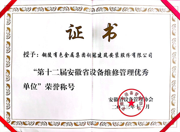 第十二屆安徽省設備維修管理優(yōu)秀單位